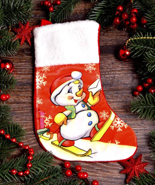 Чарівний різдвяний носок зображенням веселого сніговика стане не тільки чудовою прикрасою для будинку, але і подарує чарівну казку Вашим рідним та близьким. Розмір носка: 27х19 см. Матеріал: пальтовая тканина, штучне хутро. Малюнок при пранні зберігається таким же яскравим і насиченим.
